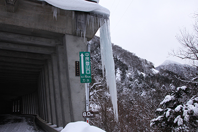 | 宮城でタクシーを降り中房温泉への林道を行く。 | 観音峠到着。降り積もった雪がお供えのよう。 |