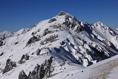 | 真っ青な空の下で合戦の頭を目指す。 | 有明山を背に合戦尾根を行く。 |