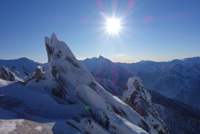 | 雪煙が輝く合戦尾根 | 表銀座縦走路と槍穂高連峰 |