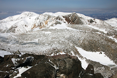 | 峰の茶屋跡避難小屋から見た茶臼岳 | 茶臼岳山頂から見た朝日岳、三本槍岳(左端)方面 |