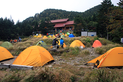 | テントがたくさん張られた聖沢小屋に到着。 | 聖平小屋の夕食。 |