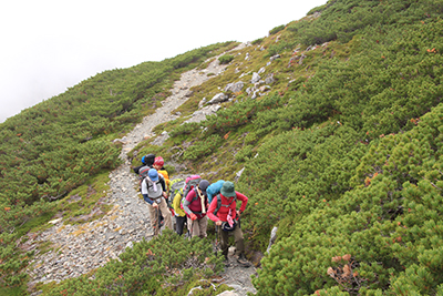 ハイマツの海となっている百間平を進む。 |