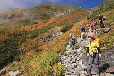 | ガレて滑りやすい登山道を下る。 | 美しい紅葉と雄大な眺めを楽しみながら下る。 |