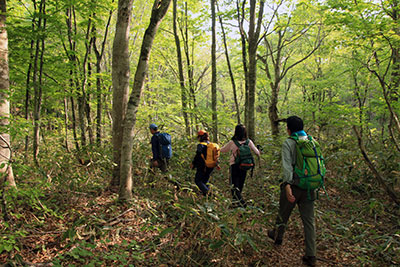| 新緑が美しいブナの林を歩く。 | スキー場を登る。 |