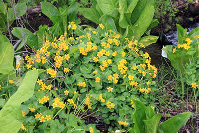 | 清流の中に咲くミズバショウ | リュウキンカ |