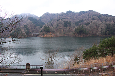 | 雪の付いた木々の向こうに宮ヶ瀬湖が見える | 雪の付いた木々と雪のないふもと |