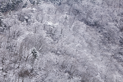 | 標高があがるにつれて雪景色となる | 雪の花を付けた木々 |