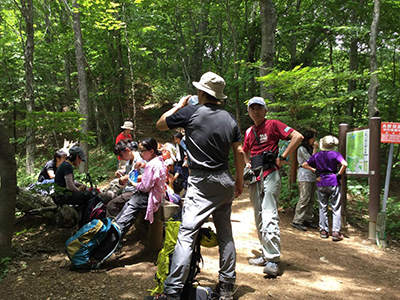 | 三頭大滝に向けて歩く。 | オオルリが見られたので、観察タイム。(Kさん撮影) |