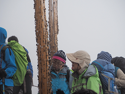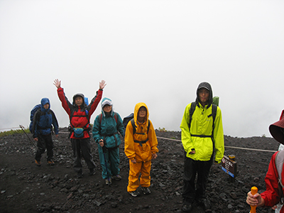 | 富士山頂に到着!みんながんばった! | 寒い霧雨の中、剣ヶ峰にも登頂! |