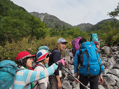| 林道から離れて小池新道を登る。 | 向こうに見えるのは槍ヶ岳かな?(Iさん撮影) |