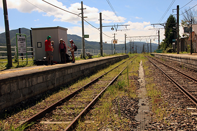 | 素朴な信濃木崎湖駅のホームで電車を待つ。 | 松本城に向かう途中でやっていた松本サマーフェスで 昼食タイムとする。発芽そばやたこ焼きを食べる。 |