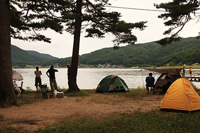| 1日目の木崎湖は曇っていた | テントでキャンプしている人たちも大勢いた |