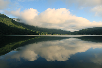 | 2日目の木崎湖 | 山や雲を映す木崎湖 |