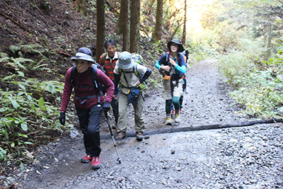 | 細い登山道を登る。(Iさん撮影) | 小仏峠にて。 |