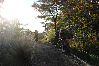 | いもがらが置いてあった。(Iさん撮影) | 広い山道を歩く。 |