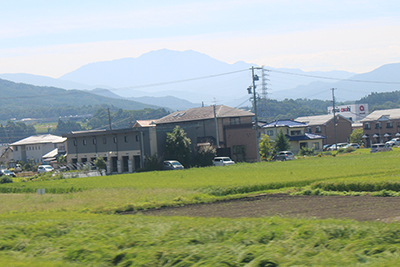 | いなかの風キャンプ場の水田と中央アルプス (右端が宝剣岳) |