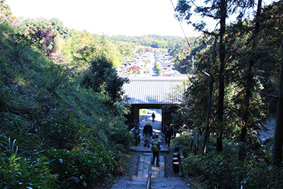 | 仁王門の階段下に到着したM君。 | 仁王門と参道。 |