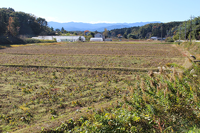 | 里の木々も紅葉が始まっている。 | 稲刈りが終わったたんぼの中の道を歩く。 |