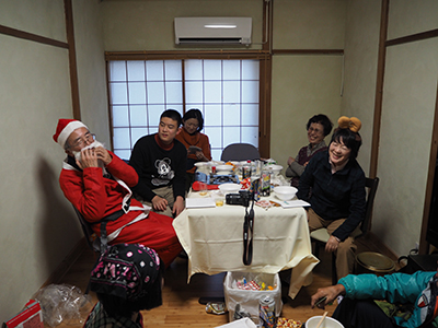 | 次第に盛り上がってきた。 | サンタに扮したM君とIさんがビンゴを引く。 |