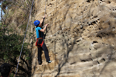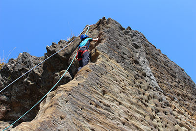 | KK君はビギナーフェース左ルート(5.8)を登り切った。 | ビギナーフェース左ルート(5.8)を登るAさん。 |