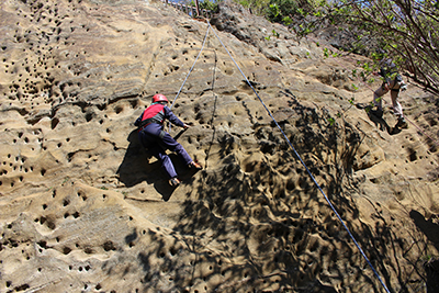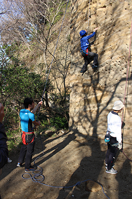 | ビギナーフェースNO.3を登るAさん。 | ビギナーフェース左ルート(5.8)を登るYKさん。 |