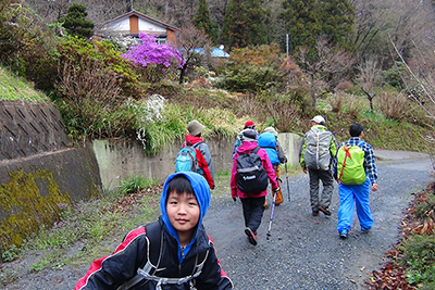 | 雨の中、波久礼駅を出発。(Iさん撮影) | 桜や木蓮の咲く舗装道路を歩く。 |