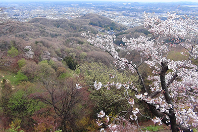 | 鐘撞堂山山頂の桜と長瀞アルプス方面 | 桜と芽吹きの山麓と麓の町 |