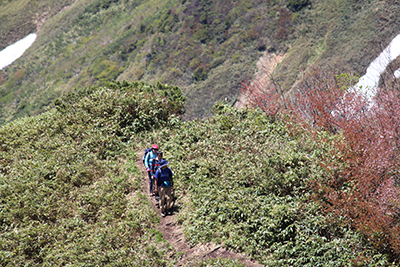 | アップダウンの続く白砂山への登山道を行く。(Iさん撮影) | 稜線にあった残雪を歩く。 |