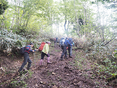 | ハンノキ沢を渡る。 | ハンノキ沢から地蔵峠への登りをがんばる。(Iさん撮影) |