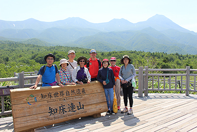 | 羅臼岳等を背に、知床五湖の木道を歩く。 | 硫黄山方面の山々と木道を歩くメンバー。 |