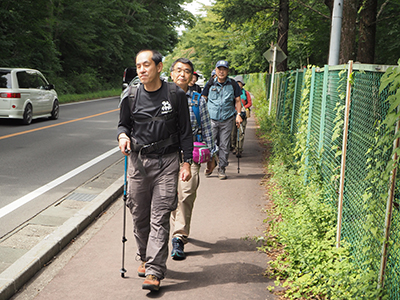 | 橅岳荘前のバス停を出発。 | 三国山ハイキングコース入口。 |