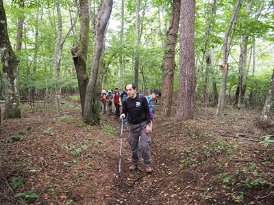 | やや足下が悪い道をサポートする。 | 歩きにくい道を慎重に下る。 |