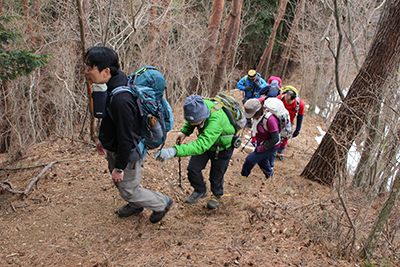 | 急坂を慎重に下る。 | もう雪がないので、アイゼンを外す。(Iさん撮影) |