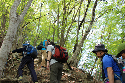 | 柔らかな新緑を楽しみながら登る。 | この平坦なところでも休憩タイム。 |