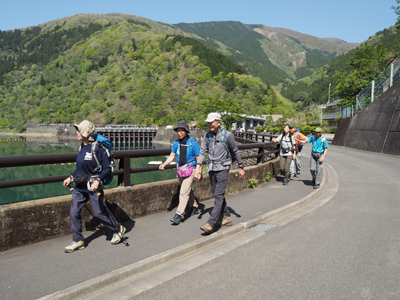 | 小河内ダムの上を歩いて登山口に向かう。(Iさん撮影) | 急な登山道を登る。(Iさん撮影) |