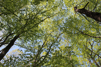 | まだ柔らかな緑の林 | 新緑の木々の葉を見上げる |