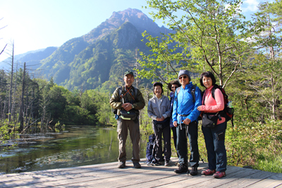 | 楽しく談笑しながら歩く。 | 霞沢岳を見ながら、梓川の畔を歩く。 |