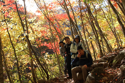 | 沢に下る道に入ると一層紅葉がきれいになる | 赤く色づいた木と紅葉がきれいな尾根 |