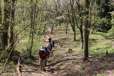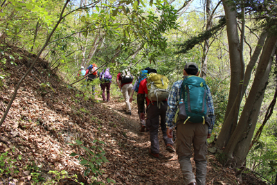 | 桜の咲く山道を下る。 | 新緑の道で小休止。 |
