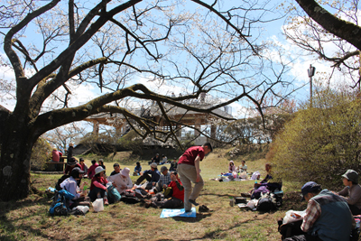 | 山頂の広場で昼食タイム。 | お昼は桜の木の下で。 |