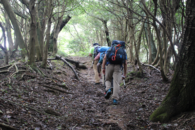 | 傾斜が急になってきた。(Iさん撮影) | リョウブの林だろうか?樹林帯を登る。(Iさん撮影) |