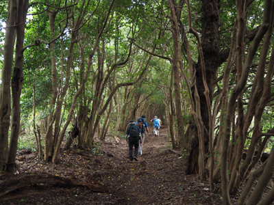 | 羽黒山山頂にて。山頂には何もない。 | 蛇塚に向けて樹林帯を登る。(Iさん撮影) |