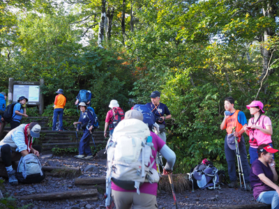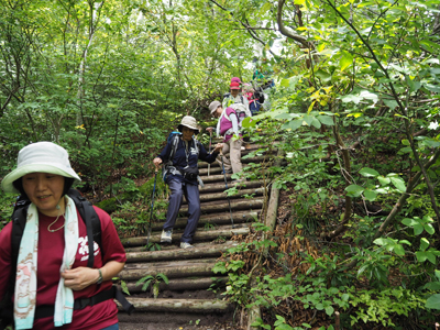 | 登山道は階段が続く。 | 三合目で休憩中。(Iさん撮影) |