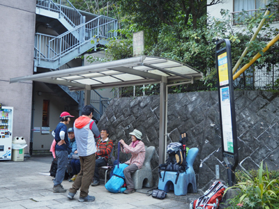 | バス停でFさんからサポートロープの指南を受ける。 (すべての写真がIさん撮影) |