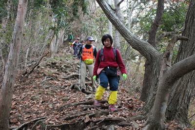 | 山頂からの下りも根が多く歩きにくい。 | MさんのサポートでMこさんも安心して下る。 |