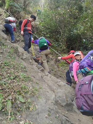 | 長い岩場を慎重に登る。 | 不慣れな人もいるので、サポートしながら登る。 |