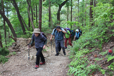 | 緑あふれる中を登る。 | 山頂近くになると階段になる。 |