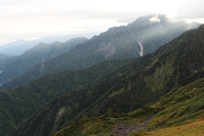 | 奥大日岳でのKさん。 | 奥大日岳からは急な下りがある。 |