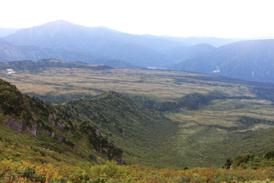 | 富山の町を下に見て大日平の草原を歩く。 | 牛首から急坂を下る。 |