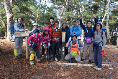 | 奥千重を過ぎ、針葉樹林帯を下る。 | 櫛形山山頂の看板にて。 |